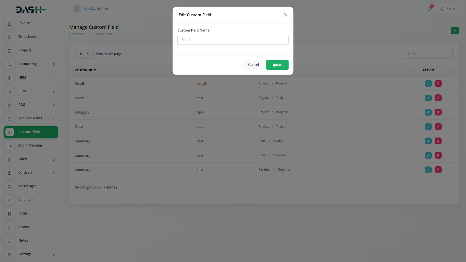 Custom Filed use in HRM, Account, Lead, Assests, Contract, Performance, Pos, Retainer, Sales, Taskly all modules.You can using custom filed collect additional information about all modules as you like.