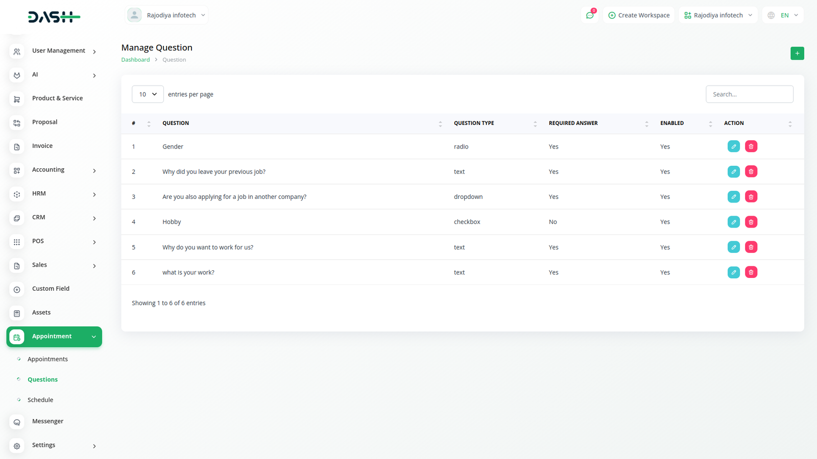 You just need to select a field and the appropriate type from the list. There are four field types available: Text, Radio, Dropdown and Checkbox You will be able to show the question without any extra effort. And you can decide whether to make that question mandatory or not. And you can also decide whether you want to keep that question in the appointment section or not.