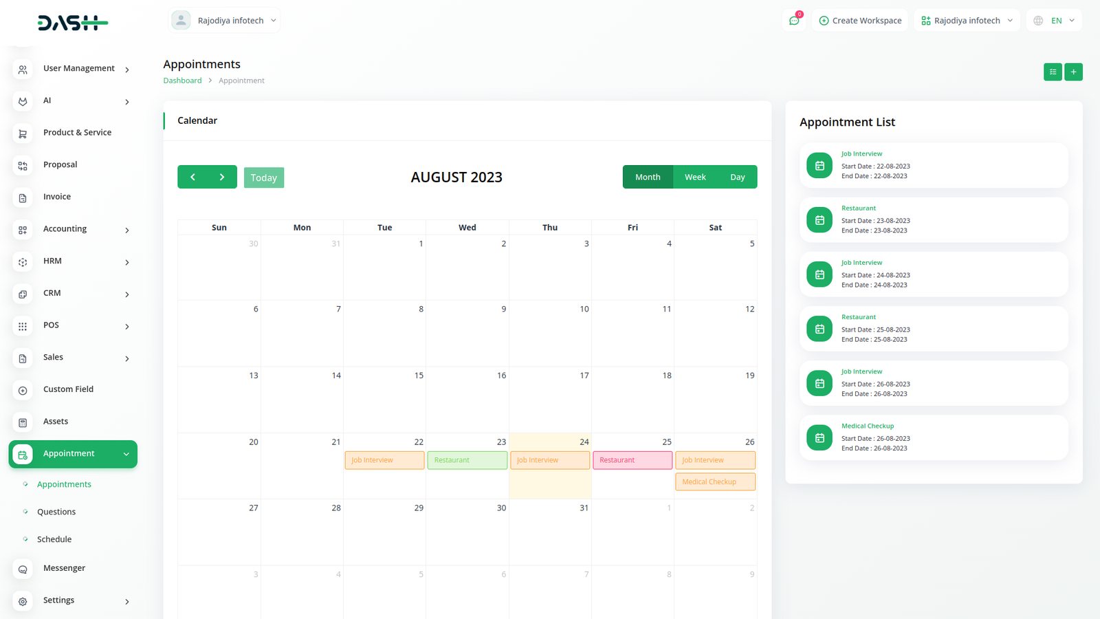 In the appointment section, you can create an appointment. It has a calendar button that displays all appointments and changes color according to the appointment status. It has a copy link button, in which any user can fill out the appointment form.