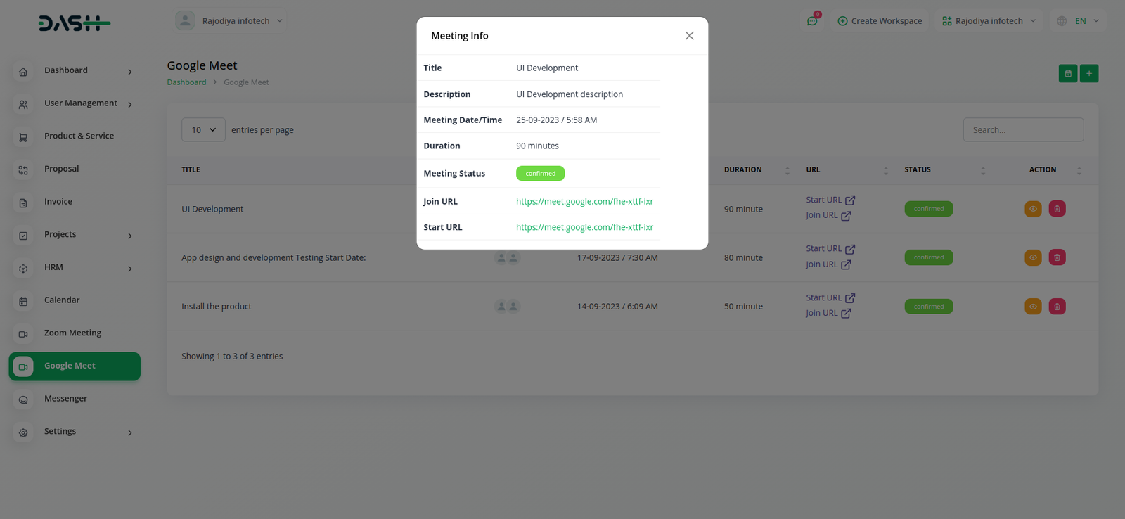Empower your team with the ability to create and schedule Google Meet sessions instantly from within Workdo-Dash. Simplify your virtual meeting experience by seamlessly generating Google Meet links, enhancing team collaboration and communication.